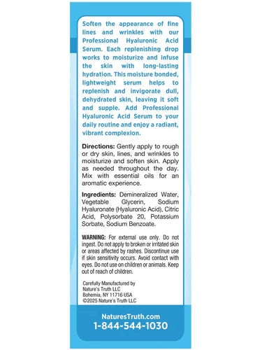 \nWe know how important a clean experience is for you and your family. That is why we use only the best ingredients when it comes to creating our Professional Hyaluronic Acid Serum. Our softening formula is Non-GMO and carefully blended to be paraben free, SLS Free, mineral oil free, gluten free, and created without any artificial fragrances so you can feel good about choosing to revitalize your skin with Nature’s Truth®.