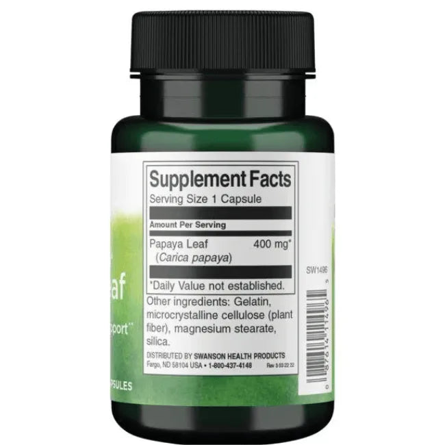 Like the fruit, Papaya Leaf features special enzymes that help break down proteins and carbohydrates for easy digestion. Traditional cultures have used papaya leaves for this and other purposes for centuries, and modern herbalists continue to recommend their use today. Swanson Premium® Brand Full Spectrum® Papaya Leaf capsules deliver whole, powdered leaves.