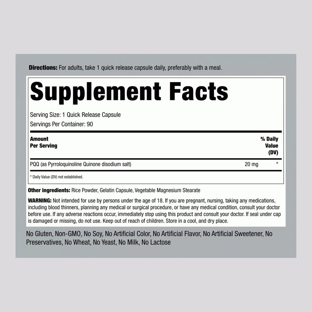 PQQ, or Pyrroloquinoline Quinone, is a potent antioxidant compound akin to a vitamin, naturally occurring in soil as well as foods like kiwifruit and soybeans. Our PQQ is crafted through a distinctive bacterial fermentation process, ensuring high quality. With just one capsule a day, you receive 20 mg of this vital nutrient, also referred to as methoxatin. Incorporating this simple-to-take formula into your daily routine is effortlessWe take pride in presenting our expanding array of Vitamin & Supplement products, meticulously crafted to aid you in reaching your wellness objectives at unbeatable prices. The richness of our selection is unparalleled. Piping Rock® offers a diverse range of products tailored for individuals of all ages and genders. Our extensive collection includes powders, softgels, liquids, and organic formulas featuring premium ingredients sourced globally. Continuously, we introduce Non-GMO, Vegan, Organic, and Gluten-Free options to cater to diverse nutritional needs. Our dynamic product line evolves daily as we persistently strive to deliver excellence to you.