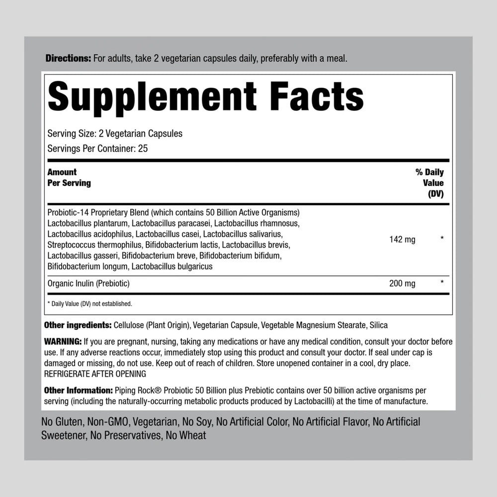 Probiotics are the organisms that colonize the digestive tract, found in nutritious foods like yogurt. A high-quality probiotic formula can bring you a balanced blend of friendly bacteria that works best with your nutrition plan.Introducing PipingRock® Probiotic-14, a next generation probiotic formula. This premium supplement features a targeted 14 strain complex with 50 billion active organisms plus FOS prebiotic in each serving. We conduct scientific testing on our probiotics to measure purity and potency, always bringing you superior quality nutritional support you can rely on for your daily routine.