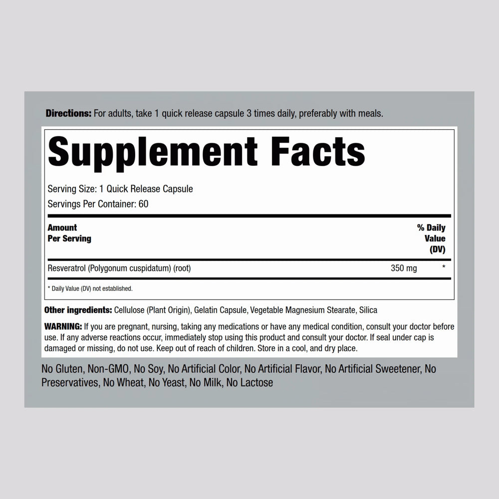 Resveratrol naturally supports overall health with the added promotion of antioxidant health. Resveratrol is found in the skin of red grapes and other plant based sources. This high quality resveratrol 350 mg supplement helps fight against cell-damaging free radicals.