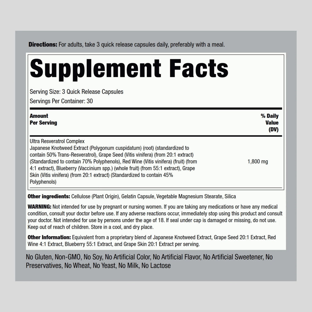 Our Resveratrol Complex quick release capsules feature 1800 mg of an Ultra Resveratrol Complex, equivalent from a proprietary blend of Japanese Knotweed Extract, Grape Seed 20:1 Extract, Red Wine 4:1 Extract, Blueberry 55:1 Extract, and Grape Skin 20:1 Extract per serving.
