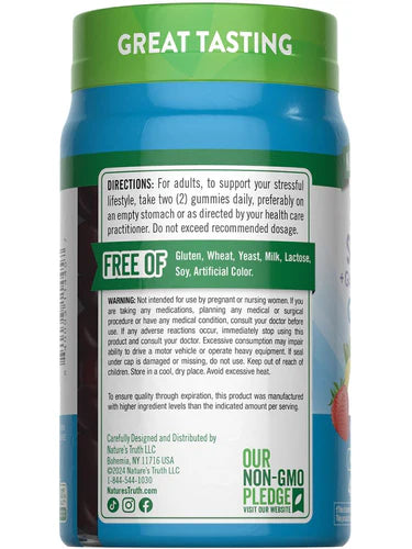 At Nature’s Truth, we know how important a clean wellness experience is for you and the ones you love. That’s why we only use the very best ingredients in the creation of our Soothing Stress Away† + GABA, L-Theanine Gummies. Our delicious gummies are Non-GMO, gluten free, dairy free and soy free, and are created without any artificial colors or artificial flavors so you can get the pure and honest nutrition you’ve come to expect from Nature’s Truth.