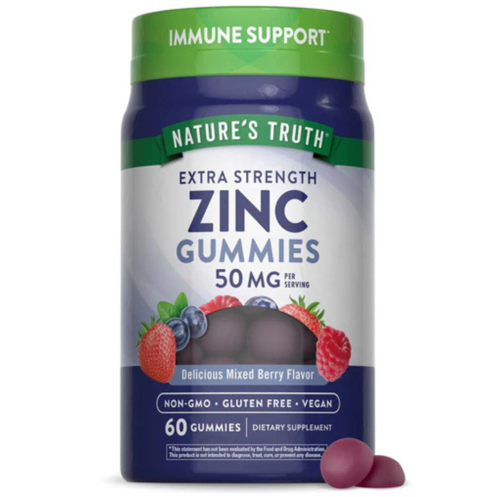Zinc is a key mineral that provides year-round support for health and wellness. Replenishing your supply of this essential mineral from foods and/or supplements can help you hit your daily requirement, since your body needs Zinc every day but is unable to produce it. These mixed berry-flavored Zinc Gummies from Nature’s Truth are a delicious and convenient way to satisfy your daily requirement for Zinc. Nature’s Truth Zinc 50mg delivers essential Zinc Citrate in each great-tasting gummy serving, providing trusted support for your immune system, skin health, and overall wellness.